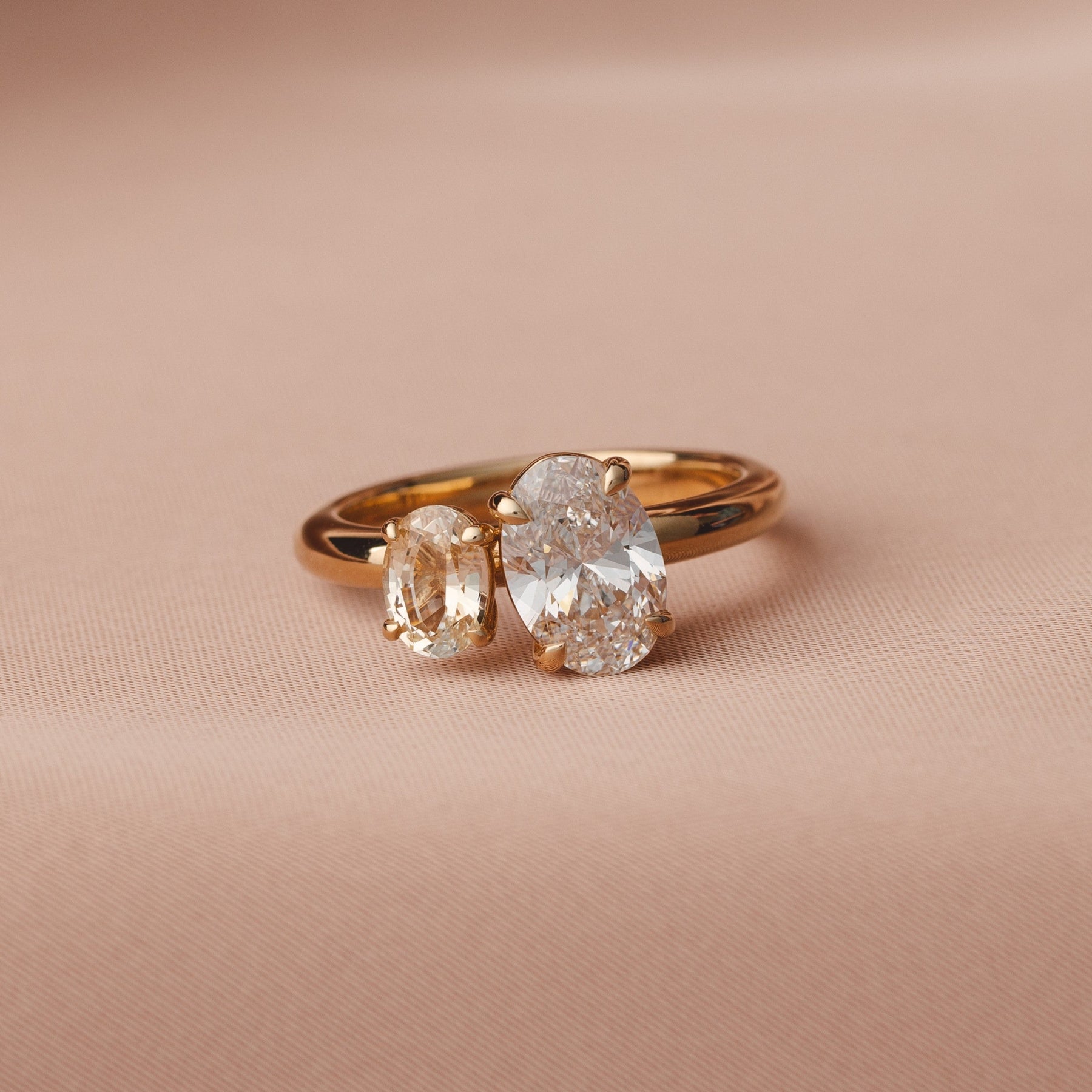 Our stunning Lara Double Oval Toi et Moi Yellow Sapphire and Lab Diamond Ring in 18 ct Yellow Gold featuring a small yellow sapphire and oval lab grown diamond.