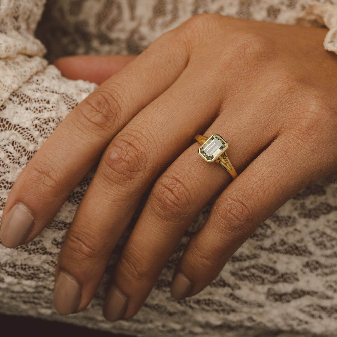 This beautiful Split Shank Green Emerald Lab Grown Diamond Bezel Engagement Ring features a stunning fancy green emerald cut lab diamond in 18 ct Yellow Gold.