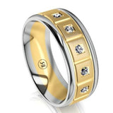 Stylish and contemporary, the impressive looking Lancaster Two Tone Gold (with White Gold Edges) wedding ring features five diamonds (5 x round 0.03 ct) positioned around the the outside of the ring. This ring is made to order and available in 9 or 18 carat Gold options.