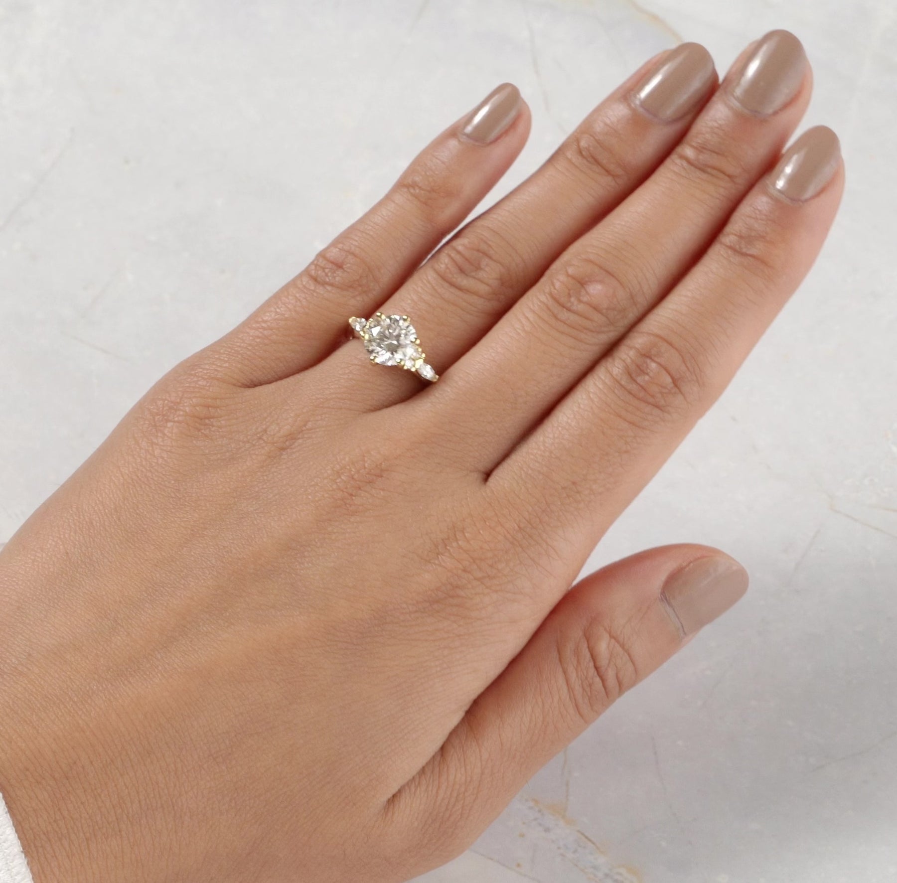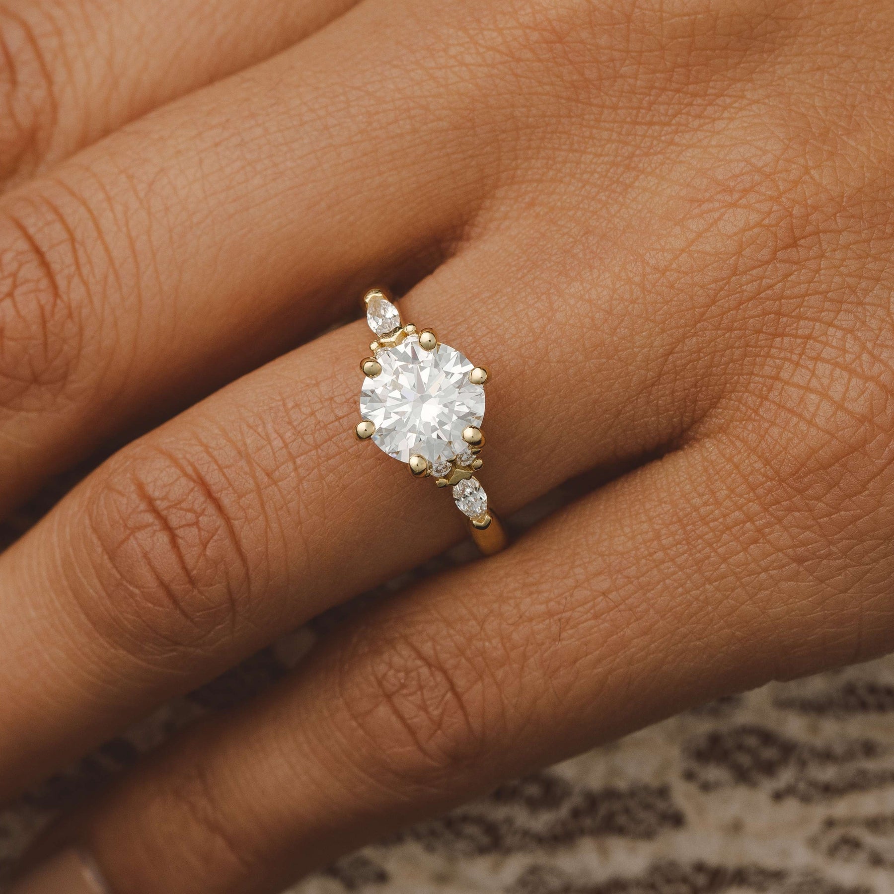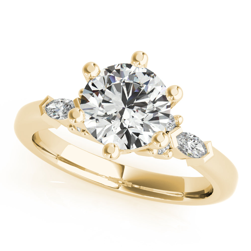 This beautiful Willow Round 6-Prong Diamond Engagement Ring setting comes with 4 round side diamonds and 2 marquise side diamonds in a classic six prong setting. This ring setting does not include the centre diamond which can be purchased separately based on your specific requirements.